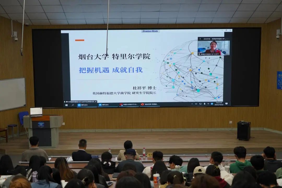 班会第二阶段由英国赫特福德大学商学院副院长杜祥平老师作《把握机遇,成就自我》主题讲座。杜祥平是英国赫特福德大学商学院研究生院首席讲师(副教授级)、英国高等教育学会会士、英国齐鲁文商会副会长、全英华人教授协会会员,更是yl6776永利集团外国语学院优秀校友。杜老师从自己的专升本、出国留学、最后“弯道超车”成功攻读教育学博士等求学经历出发,结合自己在英国期间的实践交流经验,对英国“家外家”、海外健康安全、留学生活和发展机会、QS世界大学排名等方面进行主题讲座,分享海外留学技巧。杜老师在讲座过程中不时与学生进行线上互动,不断了解学生求学意向并对大家存在的留学问题进行答疑解惑。她最后勉励同学们:要做好充足准备,抓住留学机会,保持进取态度,不断开拓视野,提升语言能力,争取获得国际化的教育资源。