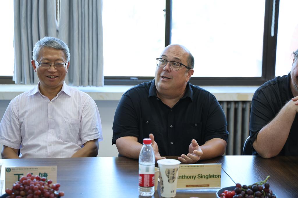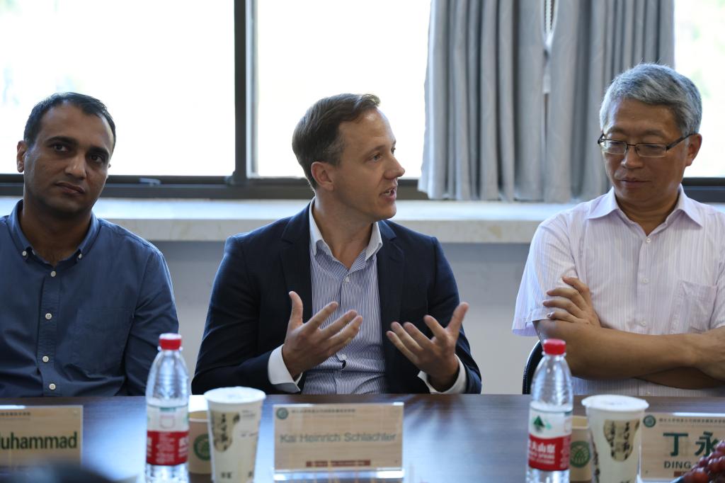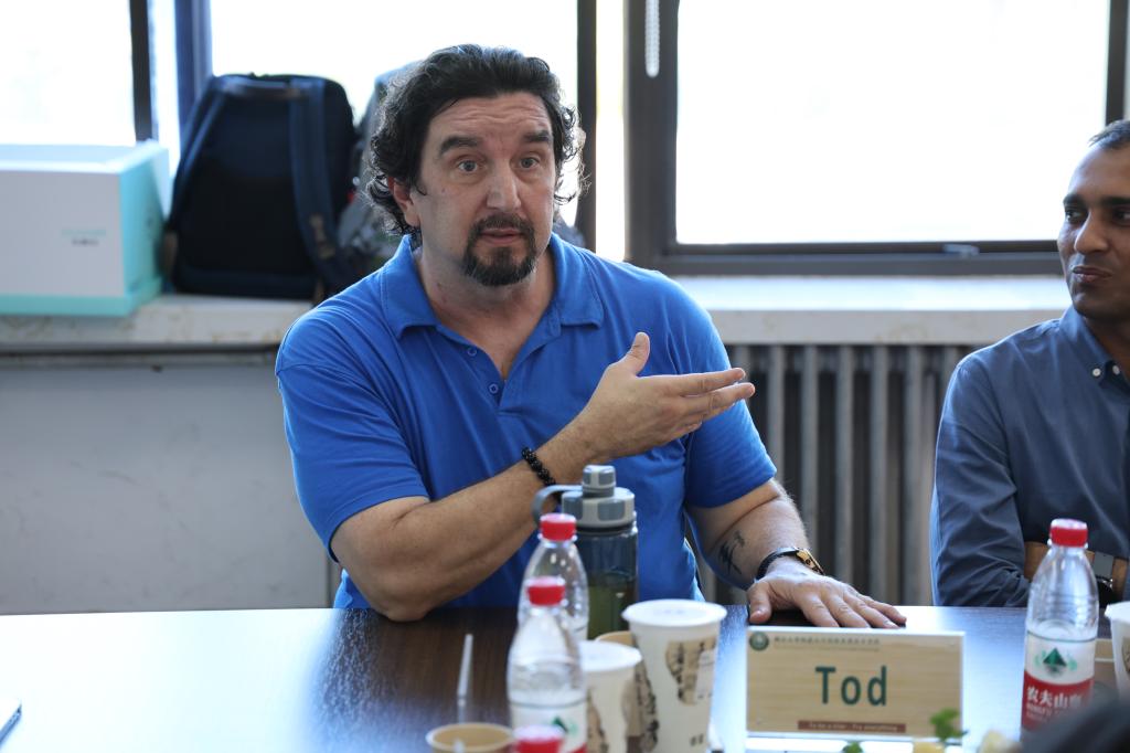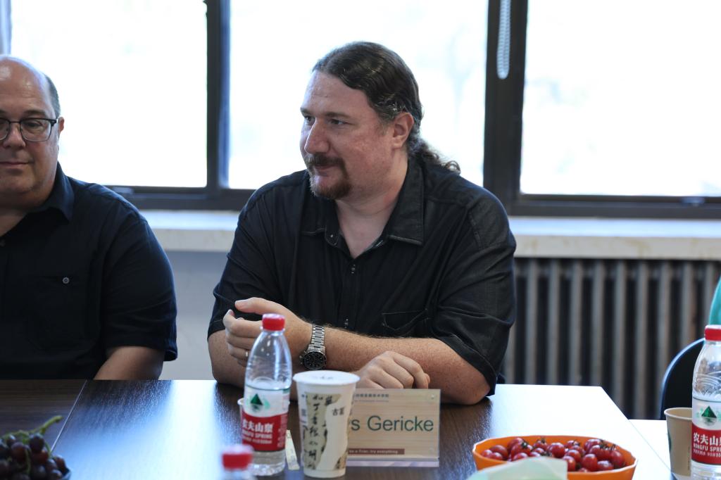 他讲到,学院坚持“面向国际,开放融合,聚焦节能,协同育人”的办学方针,积极践行低碳、环保绿色理念,致力于培养学科融合、可持续发展的“新工科”人才,努力打造“特里尔青年”靓丽名片。张西俊表示,希望通过本次中德师生茶话会,和所有外籍老师亲切交流,共谋学院事业,共绘美好蓝图,共同助力特里尔学院国际化发展。随后,外籍教师就在特里尔学院任教以来的所见所闻进行热烈发言并与与会师生亲切交流。Anthony讲到,特里尔学院的学生十分热情、善良,思维活跃,具有创新意识,对新知识充满探索精神,他非常喜欢和学生相处。外教们纷纷表示在特里尔学院工作感到特别幸福和开心,也愿意尽己所能,为学生的国际化发展和深造贡献自己的一份力量。会议最后,学院学生代表为所有外籍教师献上鲜花,感谢老师们的辛勤付出。