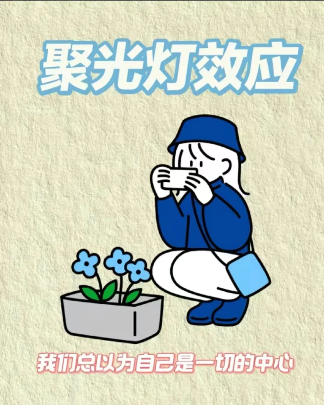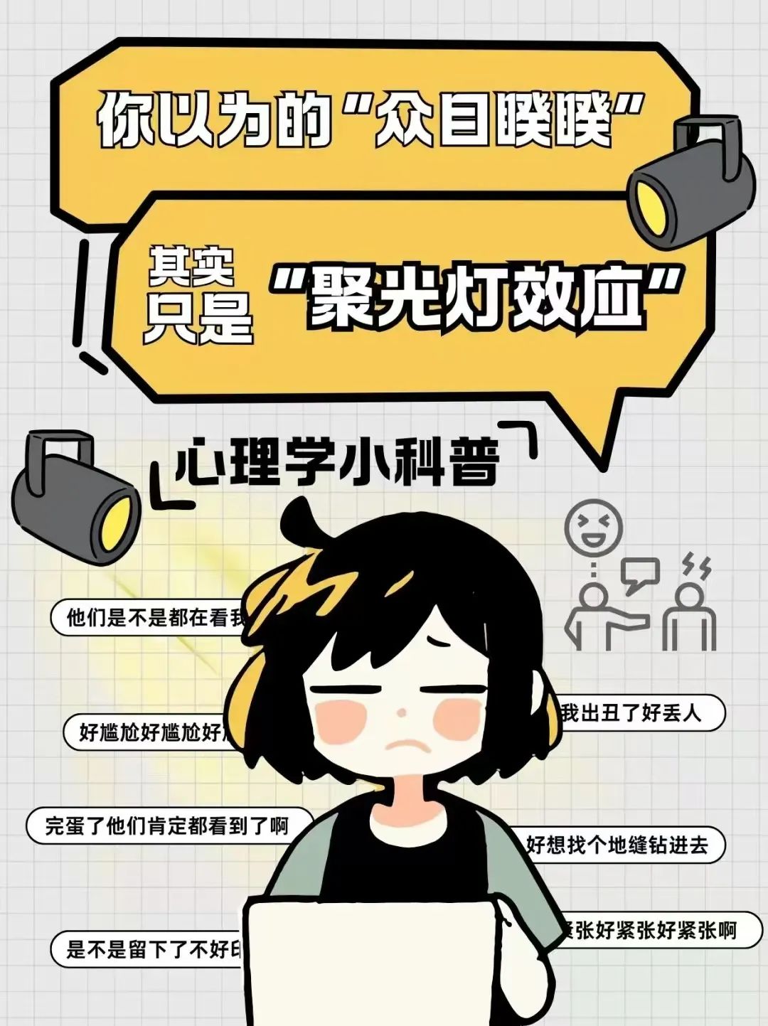 这就是聚光灯效应。我们常常会高估别人对我们的关注程度,很在意自己给别人留下了什么印象,导致我们总是认为别人对自己关注度很大,而实际上并非如此