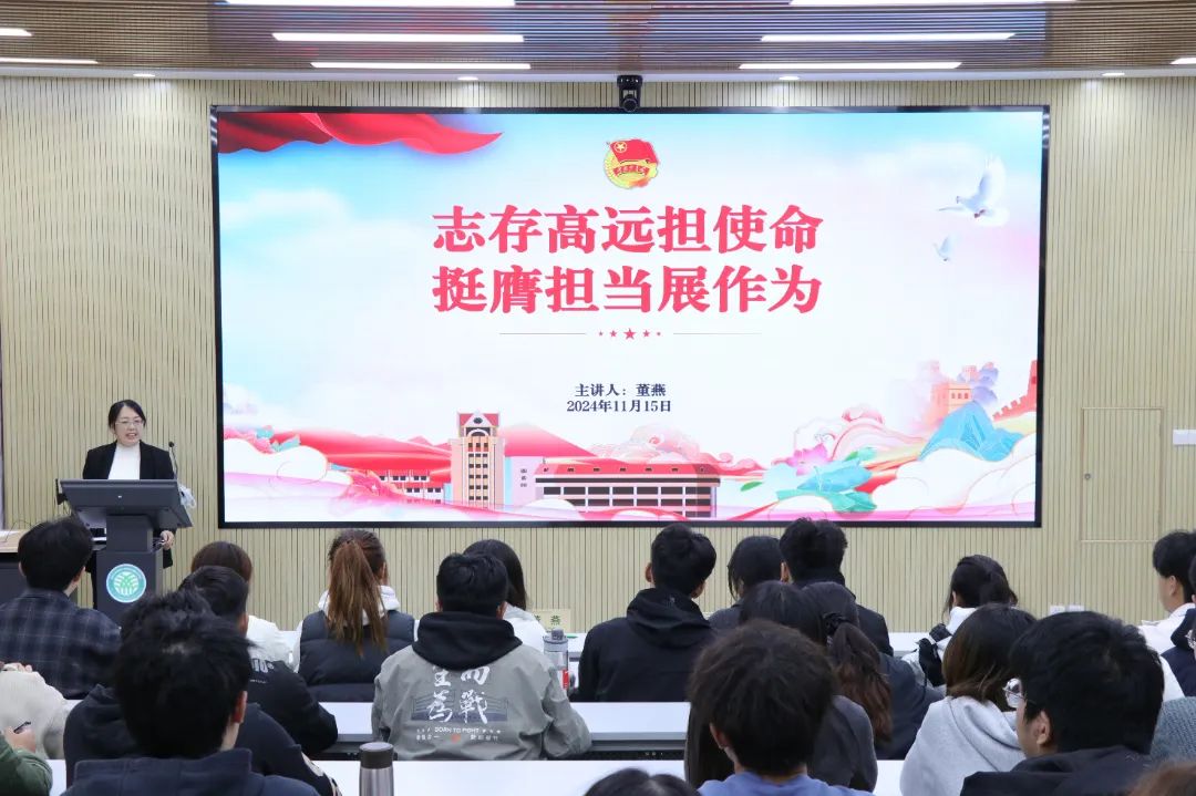 接着,董燕书记开展主题讲座。她围绕“青春与使命”、“权利与义务”、“作风与能力”三个方面展开论述。她以钱学森、邓稼先、朱光亚等“两弹一星”科学家为例,引导大家思考当代青年的历史使命和时代责任。她鼓励各位同学在学生座谈会等活动上为学院发展献言献策,增强爱校荣校责任感,在权利和义务之间找到一个平衡点。