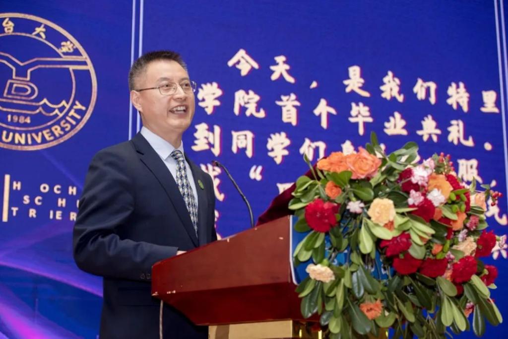 学院党总支书记张西俊作为教师代表,深情回顾了同学们与学院建设紧密相连、共同成长的美好时光,细数大家主动担当、为院争光的奋斗故事,不少师生热泪盈眶。他勉励毕业生秉持“守信、求实、好学、力行”的校训,不忘“与最优者对标,与最强者比拼,与最快者赛跑”的特院精神,继续以国际化思维、本土化操作,做人类文明互鉴的践行者与担当者。