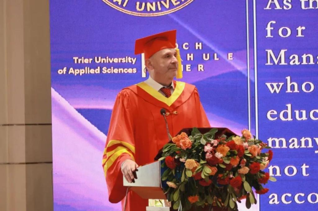 Peter Heck寄语毕业生“既要脚踏实地,更要仰望星空”,他强调,作为新时代的思考者和实践者,要传承“知行合一”的精神,将可持续发展理念转化为实际行动;要保持求知探索的勇气,在应对全球挑战中实现人生价值;要勇于开拓创新,以开放合作的姿态迎接未来。