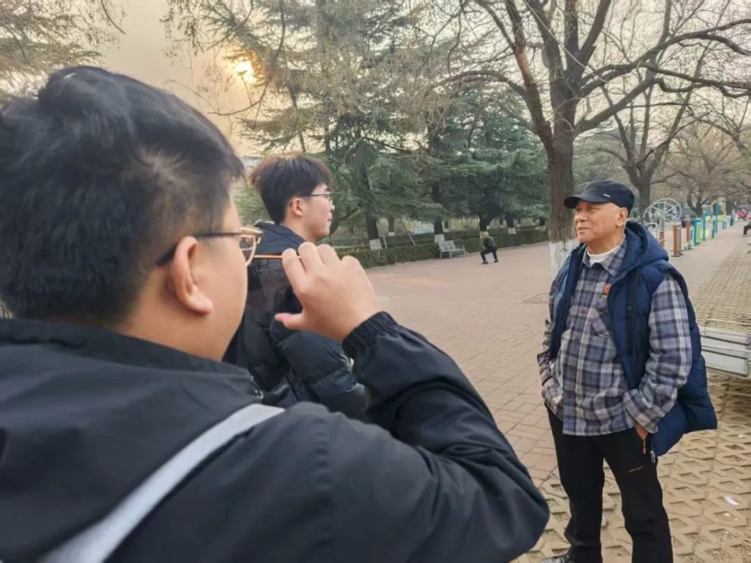 2024年12月,团队成员于济南战役纪念馆广场采访济南战役退伍老兵(拍摄人员:张博)