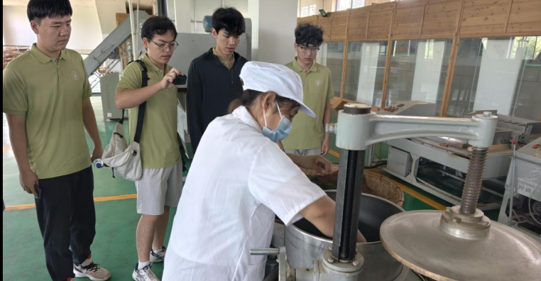 制茶车间内,茶香裹挟着岁月的厚重扑面而来。实践队围拢在老茶师王师傅身旁,凝视着铁锅间上下翻飞的叶片学习手工制茶,王师傅凭经验传授“看茶做茶”智慧,如杀青温度因叶而异、雨天炒茶时长需调整等,队员们或感知热力、或紧盯色泽、或记录“抖、搭、捺、拓”手法;生产线观摩中,他们发现揉捻机“转3停1”暗合手工韵律、干燥“先烘后晾”复刻古法逻辑,徐言森感慨“机器是现代的壳,老手艺才是里头的魂,这传承是新旧共生的智慧”,在温度与参数的碰撞里读懂非遗“守正创新”的深意。