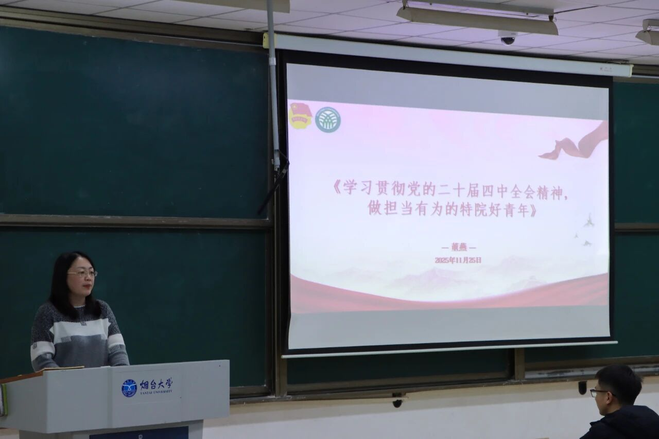 董燕以《学习贯彻党的二十届四中全会精神,做担当有为的特院好青年》为题作报告。她围绕党的二十届四中全会精神的核心要义,从“十五五”规划的战略目标切入,系统阐述了特院青年如何将个人理想融入国家发展大局。她从“深学细悟全会精神,筑牢理想信念之基”“开拓国际化视野,探索多元化发展路径”“践行新发展理念,勇担生态文明建设使命”三个方面进行阐述,寄语我院学子在理论学习中坚定信念,在专业钻研中锤炼本领,在服务社会中践行初心,以“担当有为”的实际行动,争做不负时代、不负韶华的特院好青年。