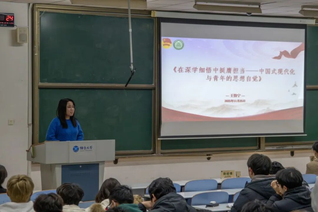 王怡宁以《在深学细悟中挺膺担当——中国式现代化与青年的思想自觉》为题作报告。她聚焦“中国式现代化”,剖析青年思想自觉与国家发展的紧密联系。她结合学院奖学金评选等制度和优秀同学事例,强调青年要以思想自觉引领行动自觉,为国家发展贡献青春力量。