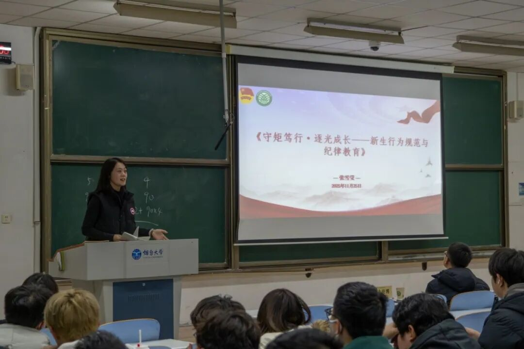 张雪莹以《守矩笃行·逐光成长——新生行为规范与纪律教育》为题作报告。围绕行为规范与纪律教育主题展开深入分享。她详细解读了校园学习、生活等行为准则,强调“大学自由存在于纪律之下”,引导新生树立规则意识,明确成长方向。