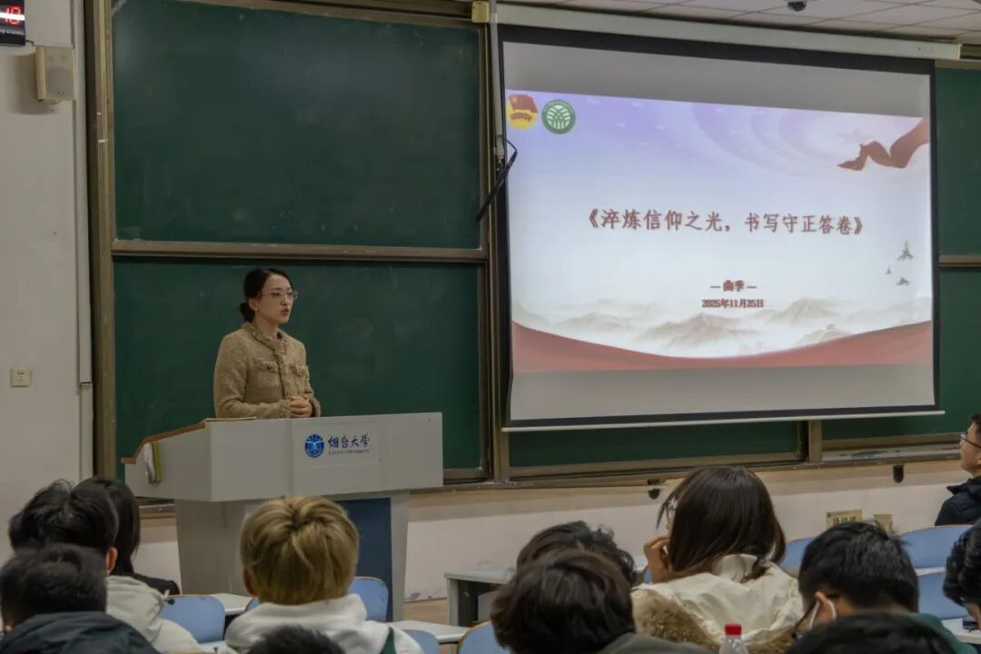 曲季以《淬炼信仰之光,书写守正答卷》为题作报告。她以“信仰淬炼”为核心,探讨新时代青年如何在复杂的环境中坚定理想信念,做有理想、敢担当、能吃苦、肯奋斗的新时代好青年。她结合过往案例着重强调团纪处分,警示同学们对校规校纪、团员纪律保持敬畏。