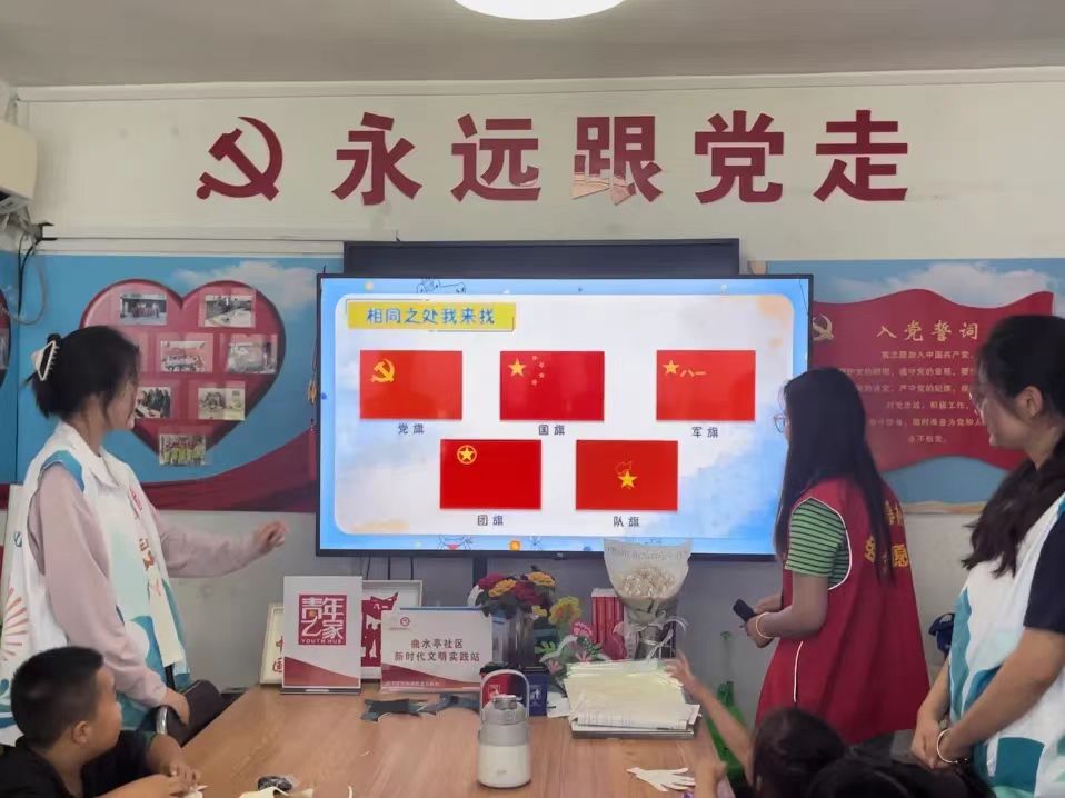 “祖国旗帜在我心”。志愿者讲解课件,认识党旗、国旗、军旗、团旗、队旗;寻找旗帜的共同元素,知道每一面旗帜图案的含义,了解旗帜的故事;通过观看新闻图片、视频,了解这些旗帜的使用场合,感受到“祖国的旗帜” 神圣不可侵犯,要依法保护。增强少年儿童对伟大祖国、对中华民族、对中华文化、对中国特色社会主义道路的认同,推动爱国主义精神在少年儿童心中扎根,引导少年儿童树立追逐中国梦、 践行中国梦的理想和追求。“美丽家园我行动”。观看视频和课件,了解日常生活中常见的垃圾,知道垃圾分类回收的重要性、 紧迫性;利用垃圾分类道具开展小组比赛和展示,养成垃圾分类的好习惯。教会同学们垃圾分类的有关知识,知道垃圾分类的类别以及如何进行生活垃圾分类,引导同学们爱护自然、保护环境,并在日常生活中养成垃圾分类的好习惯。“模拟动物运动会”。先在室内观看快乐运动微课视频,然后由志愿者组织同学们到户外模拟动物运动会。志愿者通过组织体育活动,引导同学感受健康运动的快乐,同时树立集体意识,培养沟通、交流、互动、团队合作意识。