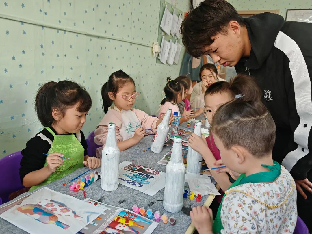 曾经被视为街头角落里的寻常之物,如今却在孩子们纯真的双手和志愿者的巧妙引导下,焕发新生。色彩斑斓的涂鸦、精致的贴饰……每一瓶酒瓶都在讲述一段独特的重生故事。孩子们的每一次涂抹、粘贴,不仅是对手艺的磨练,更是对环保理念的亲身实践。环保与美育的双重奏鸣