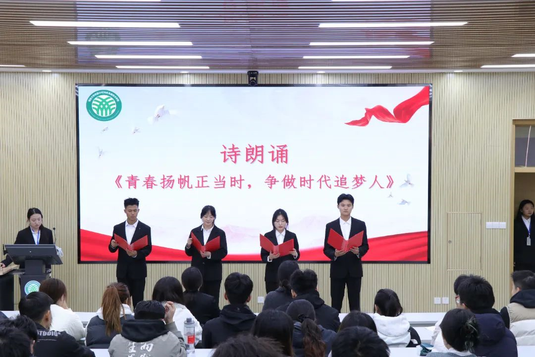 会议伊始,刘璐、高航天、孙晓、刘闻多四位同学带来了诗朗诵《青春扬帆正当时,争做时代追梦人》,激励着每一位观众勇敢追梦,不负韶华。