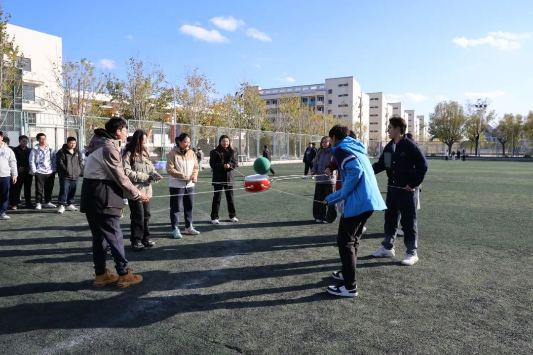 ⽓球绑在脚踝处,规定时间、范围内,剩余气球多的队伍获胜。游戏让每位同学认识到了团队的力量,培养他们的责任感与使命感。
