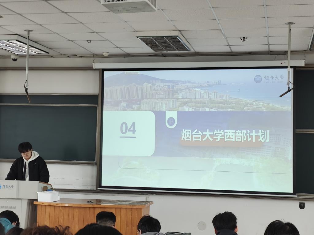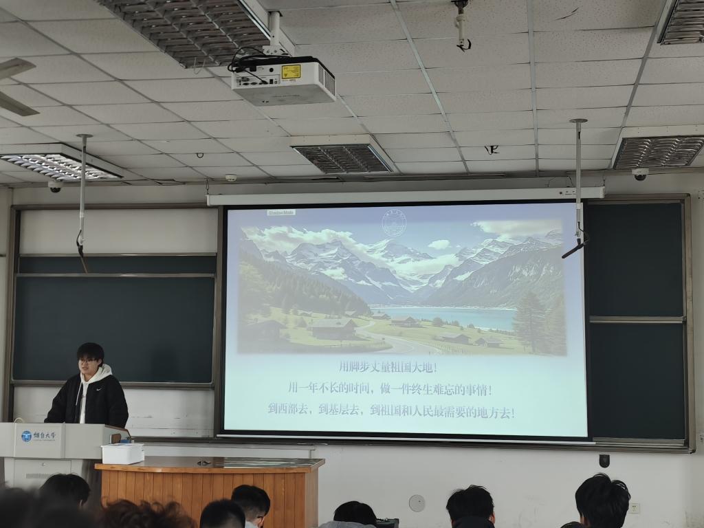 首先,由宣讲团代表对西部计划项目进行简单介绍,又依次对西部计划工作内容、相关政策及选拔流程以及yl6776永利集团西部计划进行详细讲解,帮助同学全面了解西部计划。之后宣讲团举出yl6776永利集团杰出代表逄子剑学长的例子,鼓励同学们以逄子剑学长为榜样,对人生发展树立正确认识,将个人发展与祖国和人民的需要紧密结合。