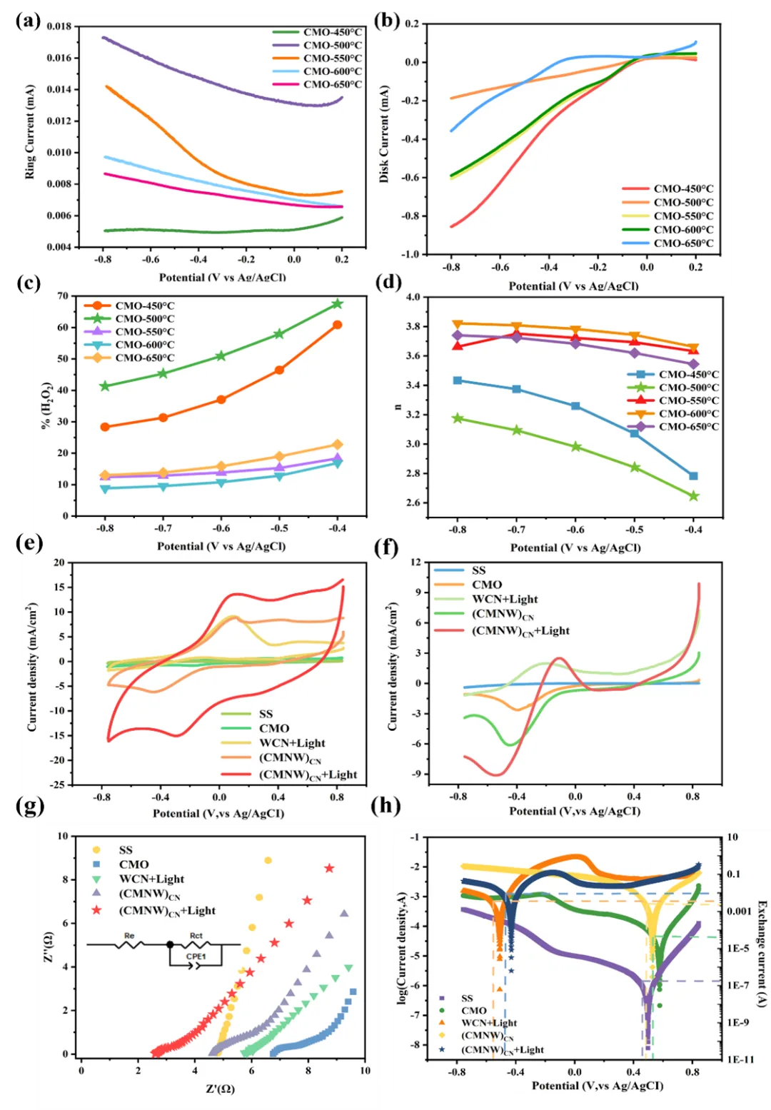 为了进一步比较(CMNW)CN电极的电化学性能,进行了循环伏安法(CV)、线性扫描伏安法(LSV)、旋转环盘电极(RRDE)、电化学阻抗谱(EIS)和Tafel试验。电化学分析实验表明,在光照条件下,(CMNW)CN电极具有较高的氧化还原电流、较低的电荷转移电阻、较大的i0、更容易发生氧化还原反应、较强的电化学活性。