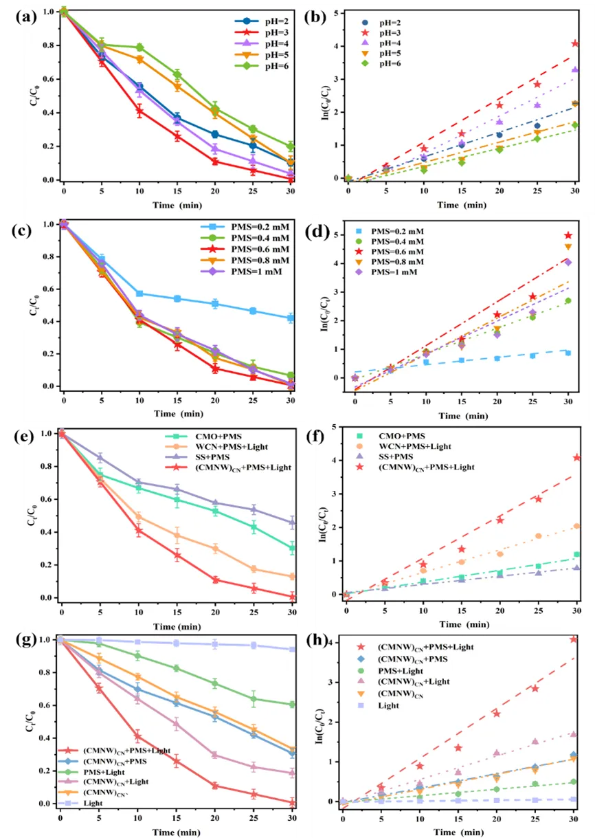 将制备的CMO电催化电极与WCN光催化电极组成(CMNW)CN电极,构建PBEF体系去除废水中的阿昔洛韦抗病毒药物。以阿昔洛韦为目标污染物,对初始溶液pH值、初始溶液中PMS添加量、不同电极类型、操作条件差异等操作条件进行了对比研究。