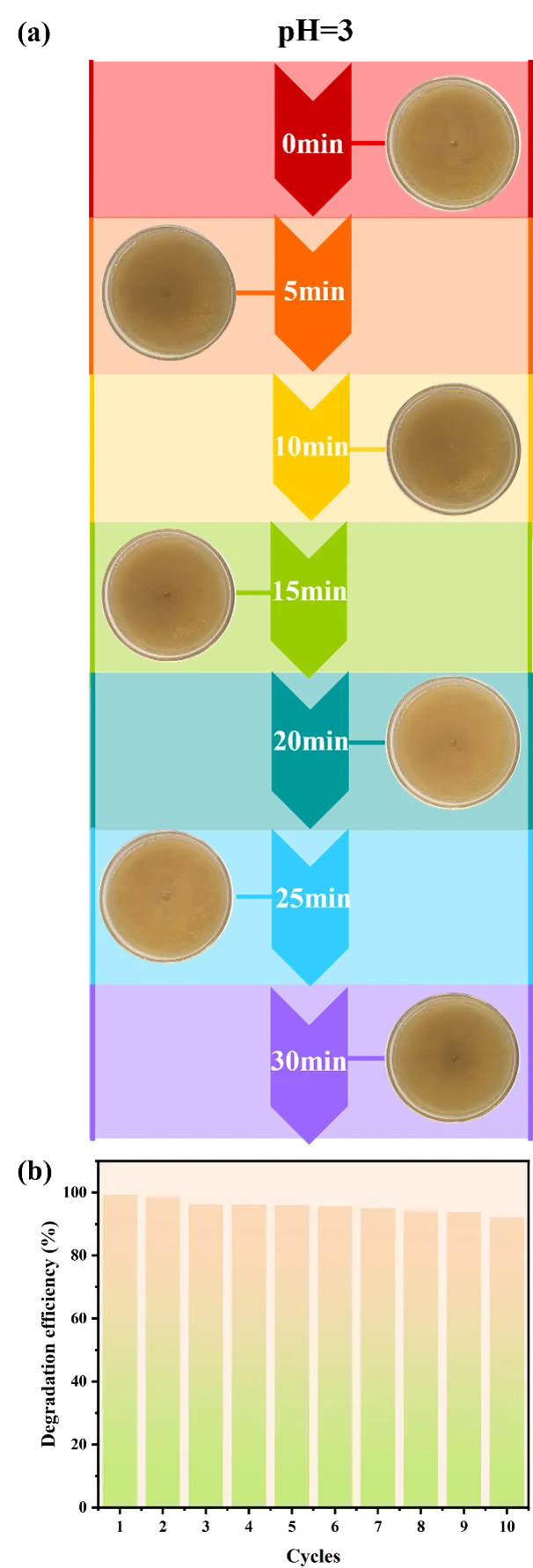 为了研究中间体在PBEF系统耦合(CMNW)CN电极降解阿昔洛韦的毒性,使用大肠杆菌进行了圆盘扩散实验。实验表明,PBEF体系耦合(CMNW)CN电极在降解阿昔洛韦过程中不产生有毒中间体。并通过循环实验证明了(CMNW)CN电极的可重用性。经10次循环后,仍保持良好的阿昔洛韦降解效率。
