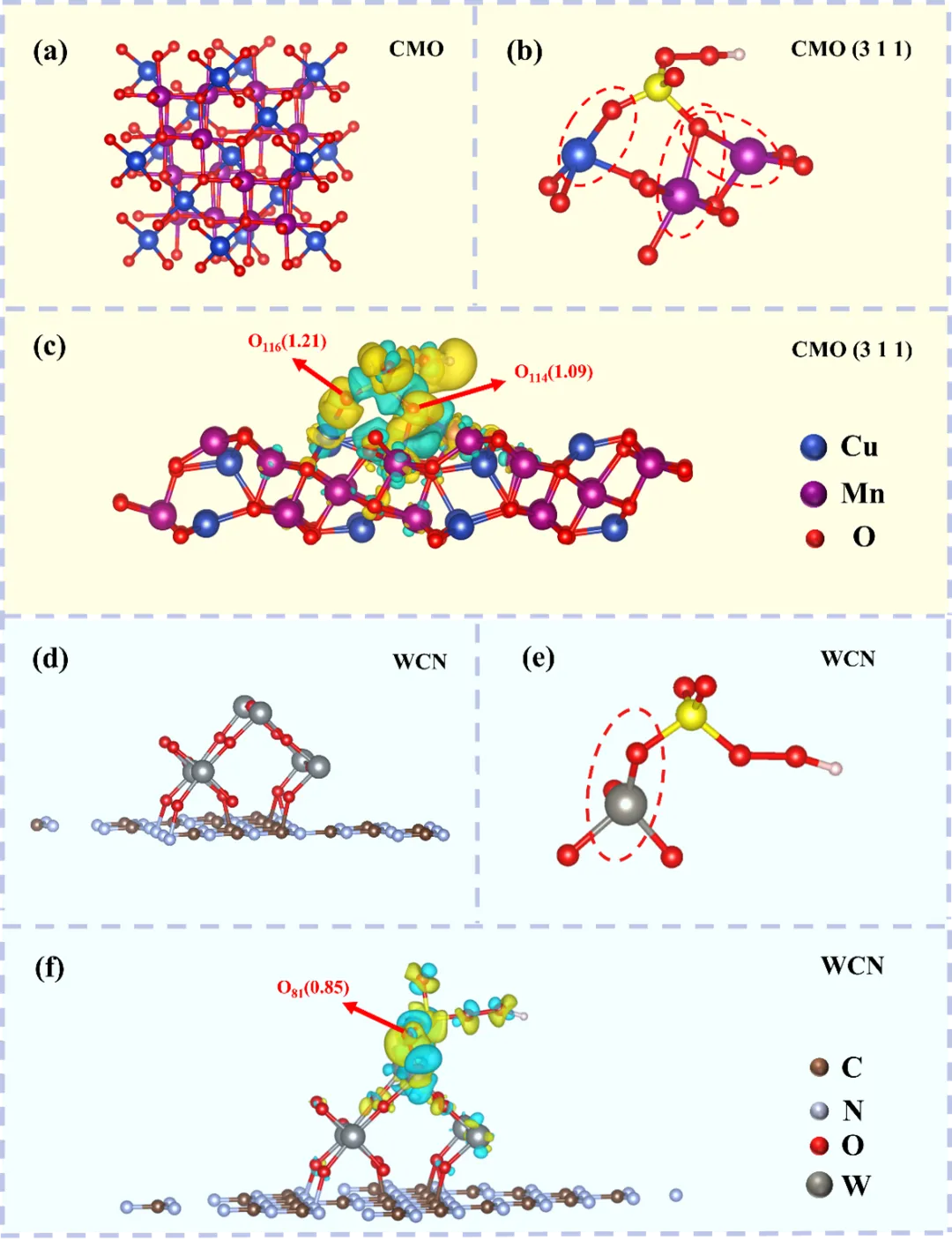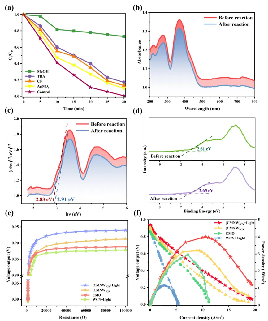 在反应前后,利用CMO电极和WCN电极的XPS光谱研究了反应降解过程。可以看出,反应前后各元素在CMO电极上特征峰的相对位置变化不大,然而,这些元素的百分比各不相同。CMO电极上的部分Cu+参与了催化反应,并转化为Cu2+,Mn2+的相对浓度下降,而Mn3+的相对浓度上升。晶格氧和表面氧相对数量的变化表明氧原子参与了这一过程,并负责原子的重组。反应前CMO电极中OLatt相对浓度较大是由于晶格膨胀或变形,产生了更多的缺陷,有利于氧空位和表面羟基的形成。反应后的CMO电极中OLatt的相对浓度降低。反应后的WCN电极表面羟基含量降低,过氧化氢含量增加,证明WCN表面发生了氧还原反应,生成了过氧化氢等物质。