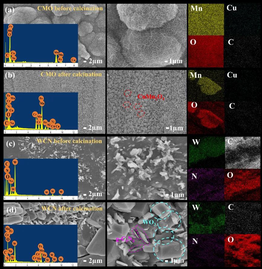 通过SEM和EDS对CMO电极和WCN电极的表面形态和元素组成进行了表征。CMO电极和WCN电极表面的催化剂均匀地分布在电极表面,这可以有效地提供许多活性点。、