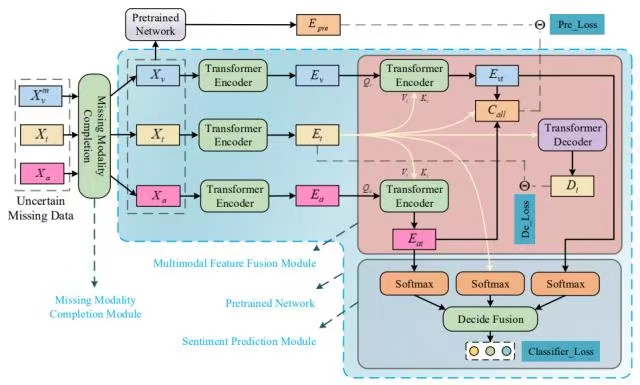 SMCMSA模型构建了全模态样本数据库,使用预训练的单模态情感分析模型对样本数据进行情感标签预测,通过设计两个独立的相似模态补全策略对缺失模态进行补全。对于补全后的数据,利用Transformer的Encoder模块对文本、视频和音频模态进行编码,并在预训练模型指导下进行模态融合,提升表示质量,并运用基于决策级融合策略得到最终的识别结果。目前,该模型的情绪识别准确度处于领先水平。该研究工作得到了国家自然科学基金项目、山东省自然科学基金重点项目、山东省泰山特聘学者项目、澳大利亚研究理事会(ARC)未来奖学金和发现项目的支持。