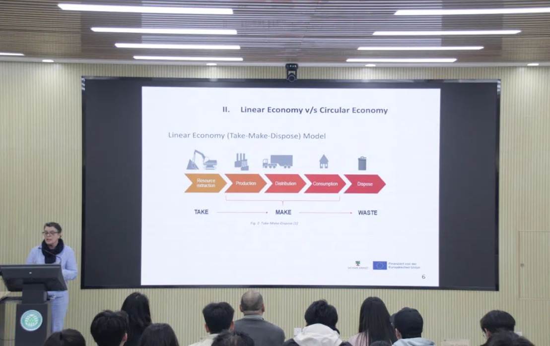 Gerke教授凭借丰富的专业知识和实践经验,开启了深入浅出的讲解。在对比线性经济与循环经济时,Gerke教授指出,线性经济遵循“开采 - 生产 - 消费 - 废弃”的模式,这种模式下资源消耗巨大,废弃物大量产生,给环境带来了沉重的负担。而循环经济形成闭合圆环,能大幅减少资源浪费和环境破坏,实现资源利用与环境保护的双重目标,为可持续发展提供了更优解。