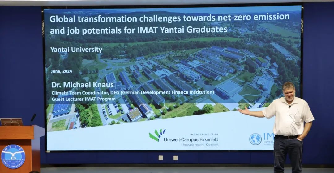 为增进中外学术交流,促进学生了解全球气候变化领域世界发展前沿,同时营造良好学术氛围,我院于2024年6月6日下午在承先厅举办“全球向零排放转型的挑战及对IMAT烟台毕业生的就业潜力”讲座,该讲座作为学术校庆系列活动之一,特邀德国发展金融合作组织(DEG)气候团队主席Michael Knaus博士主讲。Knaus博士凭借其丰富的学术背景和实践经验,为在场师生带来了一场内容丰富、视野开阔的学术盛宴。