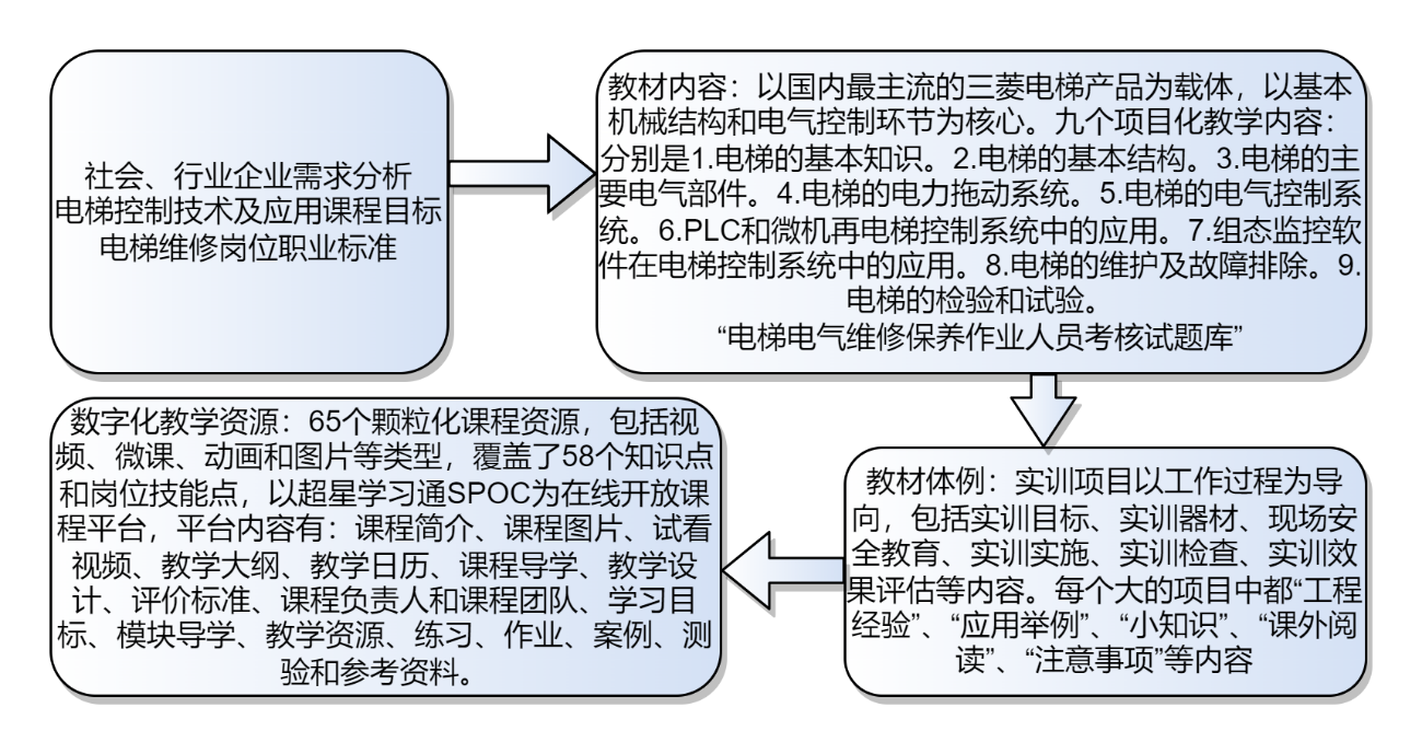 《用微课学•电梯及控制技术》的教材体例以项目的方式呈现,每个项目先行介绍相关知识点,完成学生的知识目标后,学生需运用所学知识与技能完成一个实训项目。实训项目以工作过程为导向,包括实训目标、实训器材、现场安全教育、实训实施、实训检查、实训效果评估等内容。每个大的项目中都“工程经验”、“应用举例”、“小知识”、“课外阅读”、“注意事项”等内容,不仅提高了工程实用性,也可以完成课程的思政育人目标。为深度对接职业技能等级证书,教材最后还配备了“电梯电气维修保养作业人员考核试题库”。《用微课学•电梯及控制技术》教材还构建了“互联网+行业职教”资源体系。建立了65个颗粒化课程资源。这些资源包括视频、微课、动画和图片等类型,覆盖了58个知识点和岗位技能点,全方位支撑学习过程,保障学习效果。电梯及控制技术课程使用超星学习通SPOC作为在线开放课程平台,根据国家和辽宁省精品在线开放课程建设技术要求,完成了基本资源的开发,包括,课程简介、课程图片、试看视频、教学大纲、教学日历、课程导学、教学设计、评价标准、课程负责人和课程团队。完成了知识模块的开发,包括,学习目标、模块导学、教学资源、练习、作业、案例、测验和参考资料。课程的数字化教学资源(视频、微课、动画等)均生成了二维码,穿插打印在纸质版教材相应的知识点,可供学生扫码观看学习。同时还开发了介绍电梯从业人员的职业道德准则、劳模工匠事迹、科技创新时事等课程思政内容。开发了电子活页教材对教材内容进行补充,补充了欧姆龙变频器使用手册和欧姆龙PLC编程指令表,还可以适时更新最新技术、标准等信息。